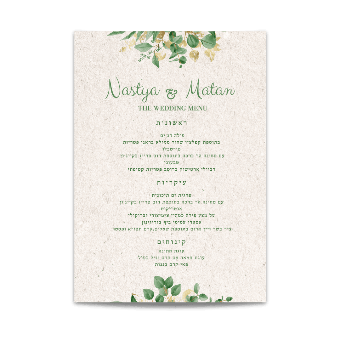 תפריט נקי ואלגנטי שמוסיף טאצ' של יוקרה לשולחן. מתאים לאולמות ואירועים בסגנון מודרני ומוקפד.