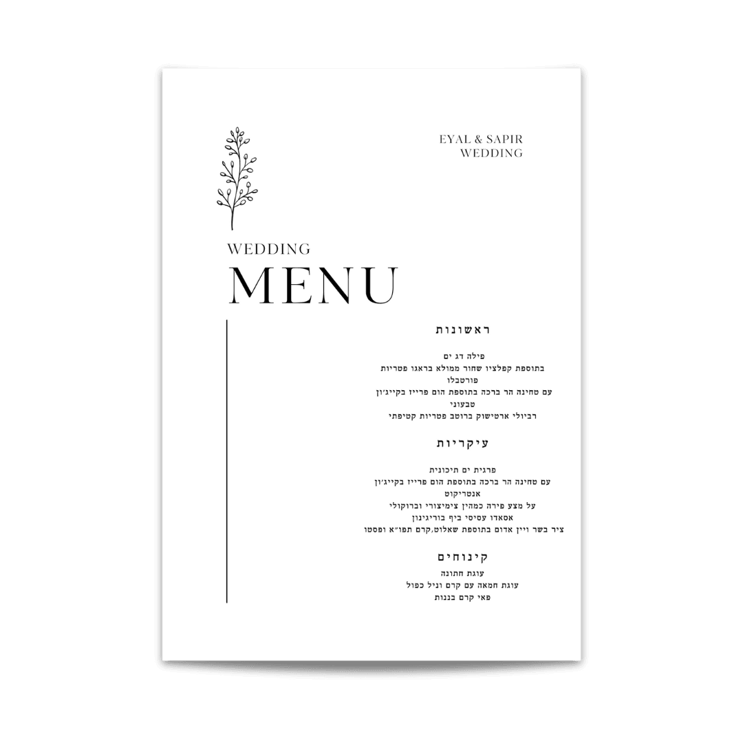 תפריט בעל קווים נקיים שמתאים לכל עיצוב שולחן. מעניק לאירוע מראה הרמוני ומודרני, תוך שמירה על פונקציונליות ונוחות לאורחים.